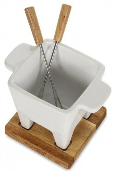 - Käsefondue-Set bestehend aus Käsefonduetopf aus Steingut, Eichenholzbrett, 2 Edelstahl-Gabeln und einem Teelicht