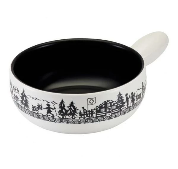 Caquelon Induktion Alpweide 23cm. Der Caquelon hat ein bezauberndes Design. Weiß grundiert wird die Schweizer Alpweide als Scherenschnitt dargestellt. Das außergewöhnliche Muster macht Ihr