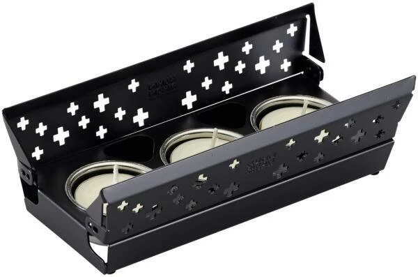 Die Zutaten werden im Grill-Pfännchen nur durch die Kerzenflamme in kürzester Zeit zum Garen gebracht. Das ausgestanzte Schweizer Kreuz-Motiv kommt bei lodernder Flamme besonders gut zur Geltung und hinterlässt einen bleibenden Eindruck.