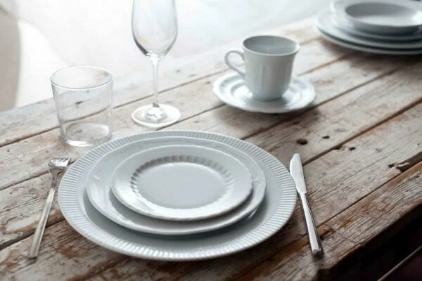 Pillivuyt Teller flach Eclectique Bordeaux in weiß. Die Serie Eclectique wurde im 19. Jahrhundert entwickelt und präsentiert sich in weiß und eleganten Grautönen, die in Kombination miteinander besonders gut zur Geltung kommen.