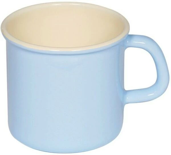 Riess Becher aus Emaille in pastell-blau. Trinkbecher mit Griff und Bördelrand aus Emaille, ideal für Tee, Kaffee und andere Heiß- oder Kaltgetränke. Warme Getränke können direkt in der Tasse auf dem Herd erwärmt werden.