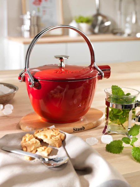 Staub Teekanne aus Gusseisen sieht nicht nur urig aus, sondern ist aus vielerlei Hinsicht äußert praktisch. Aufgrund der hervorragenden Wärmespeicherung von Gusseisen bleibt der Tee lange warm. Und da Gusseisen problemlos auf den Herd gestellt werden kann, kommt diese Kanne auch als Wasserkessel zum Einsatz.