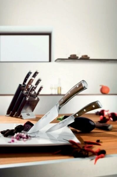 Die Griffe aus afrikanischem Grenadill Holz und die excellente Formgebung setzen neue Maßstäbe. Individualität, Funktionalität und Exklusivität werden bei der neuen Messerserie eindrucksvoll vereint. Messer IKONEN für anspruchsvolle Profi- und Hobbyköche. Grenadill Holz ist dichter und fester als Ebenholz. Durch den hohen Harzgehalt ist es relativ unempfindlich gegen Feuchtigkeit und bleibt formstabil. Die feine Maserung und die dunkle Farbe verleiht dem Material eine edle Optik. Neben dem ansprechenden Design erfüllt Wüsthof Ikon natürlich auch alle funktionalen Anforderungen eines Wüsthof Messers: es ist aus einem Stück Edelstahl (Chrom Molybdän Vanadium) geschmiedet und der Spezialschliff zeichnet sich durch eine extreme Schärfe aus.